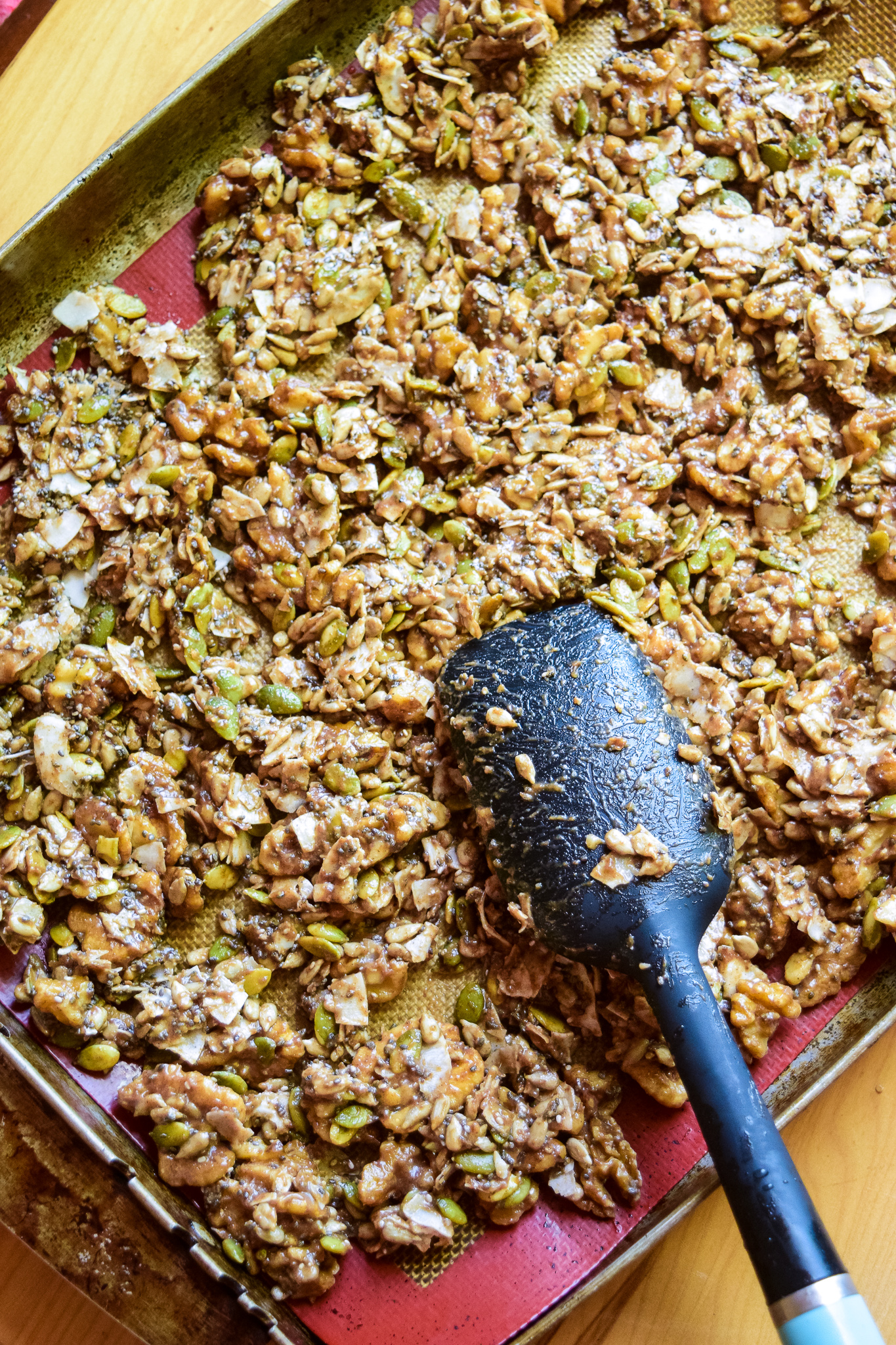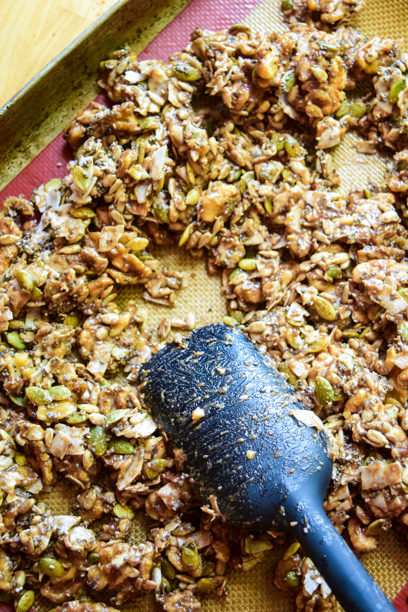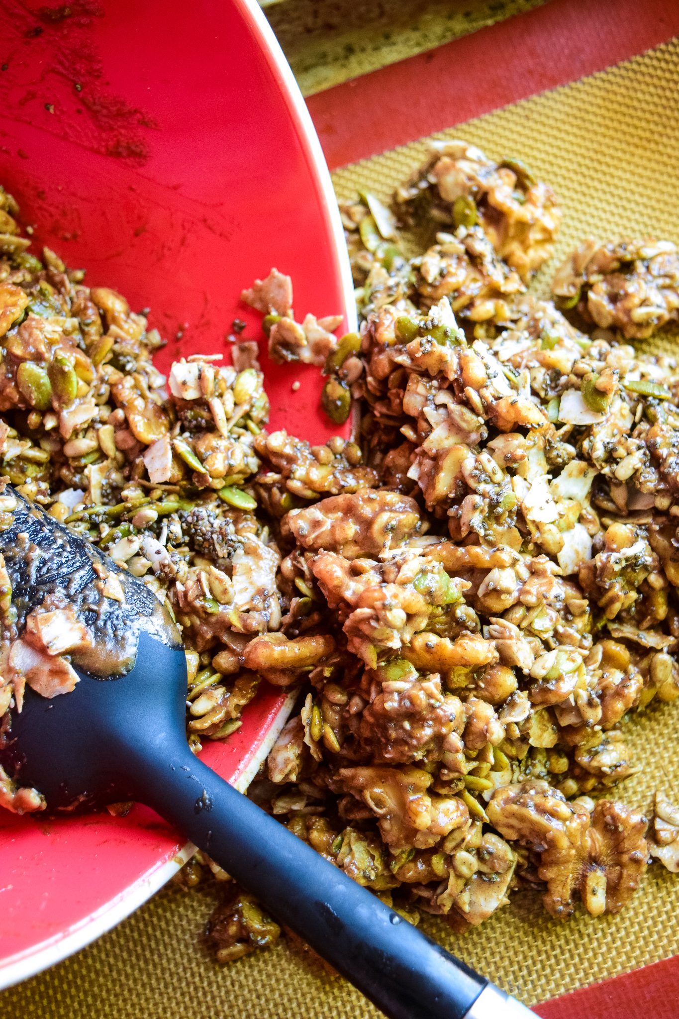 When you mix all the ingredients together, make sure the nuts and seeds are evenly coated. Then pour onto a lined baking sheet and spread into an even layer.