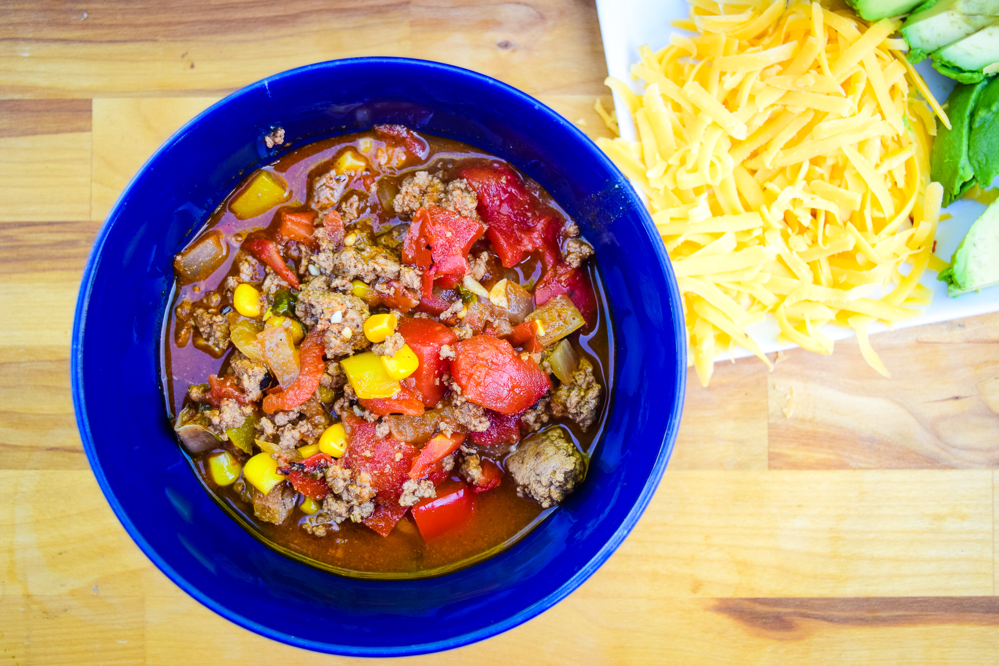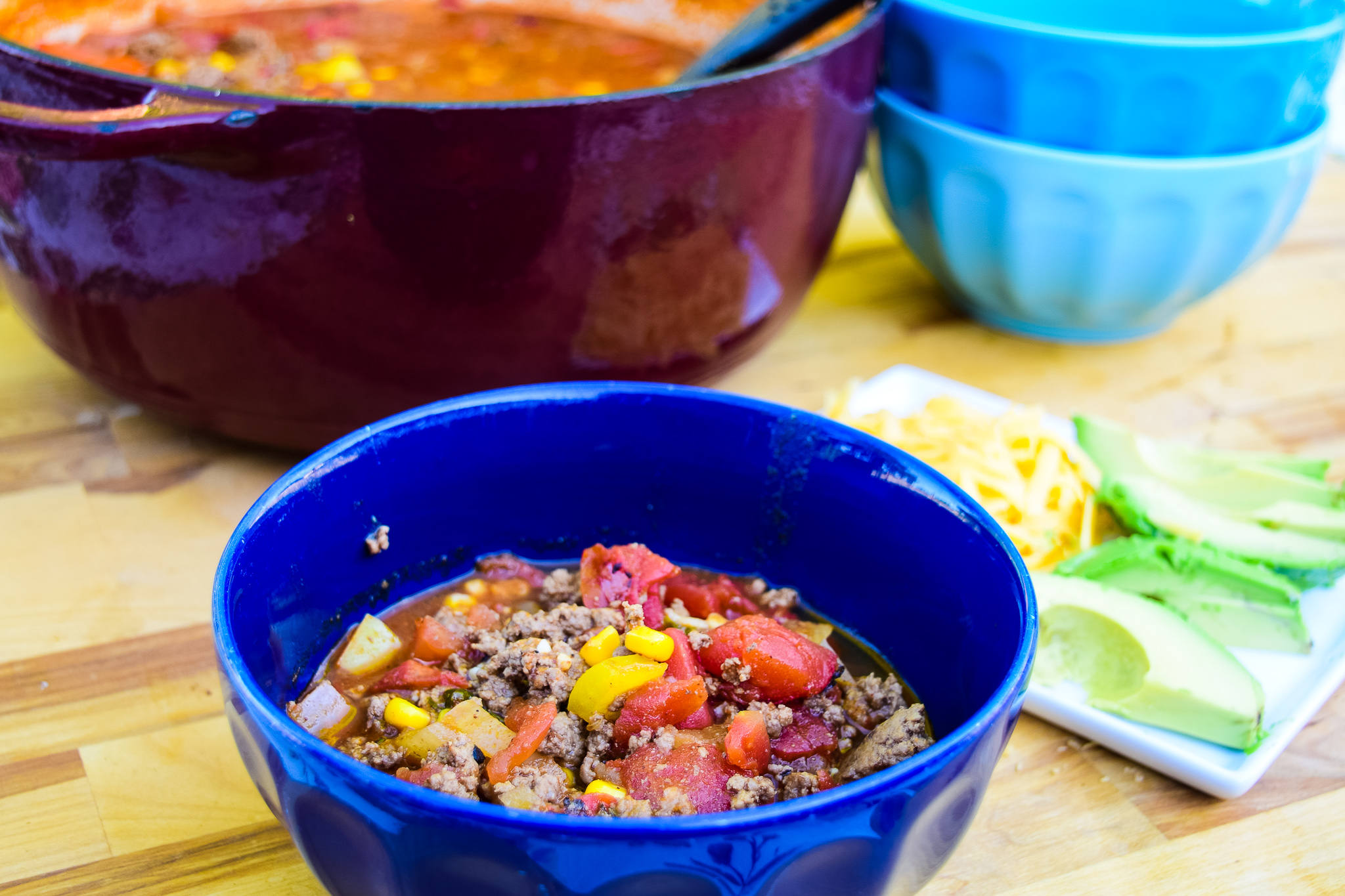If you’re rolling in fresh summer tomatoes, you can use those in the recipe instead of canned! Get that roasted depth of flavor in your taco soup by giving them a quick spin in the oven. Dice and seed about 2lbs of tomatoes and place on a rimmed baking sheet. Sprinkle with salt and a drizzle of olive oil. Broil for 10-12 minutes, until tomatoes begin to char. This will add a bit of time to your dinner prep! I recommend preparing the tomatoes first, then while they are roasting, getting the beef going and following the recipe from there.